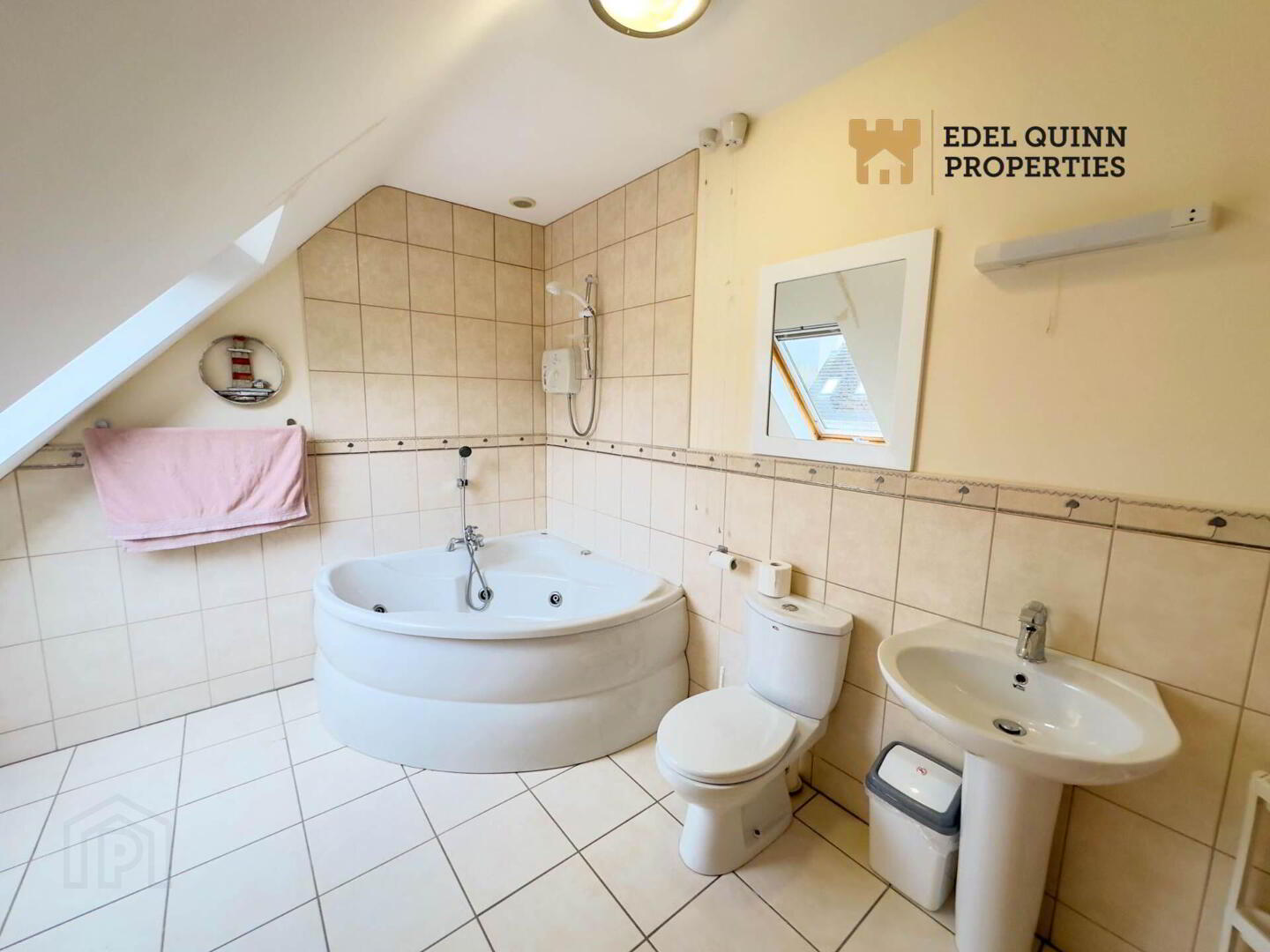 Tiled, 1no. velux, 1no. radiator, corner bath, electric shower, wc, wash hand basin
