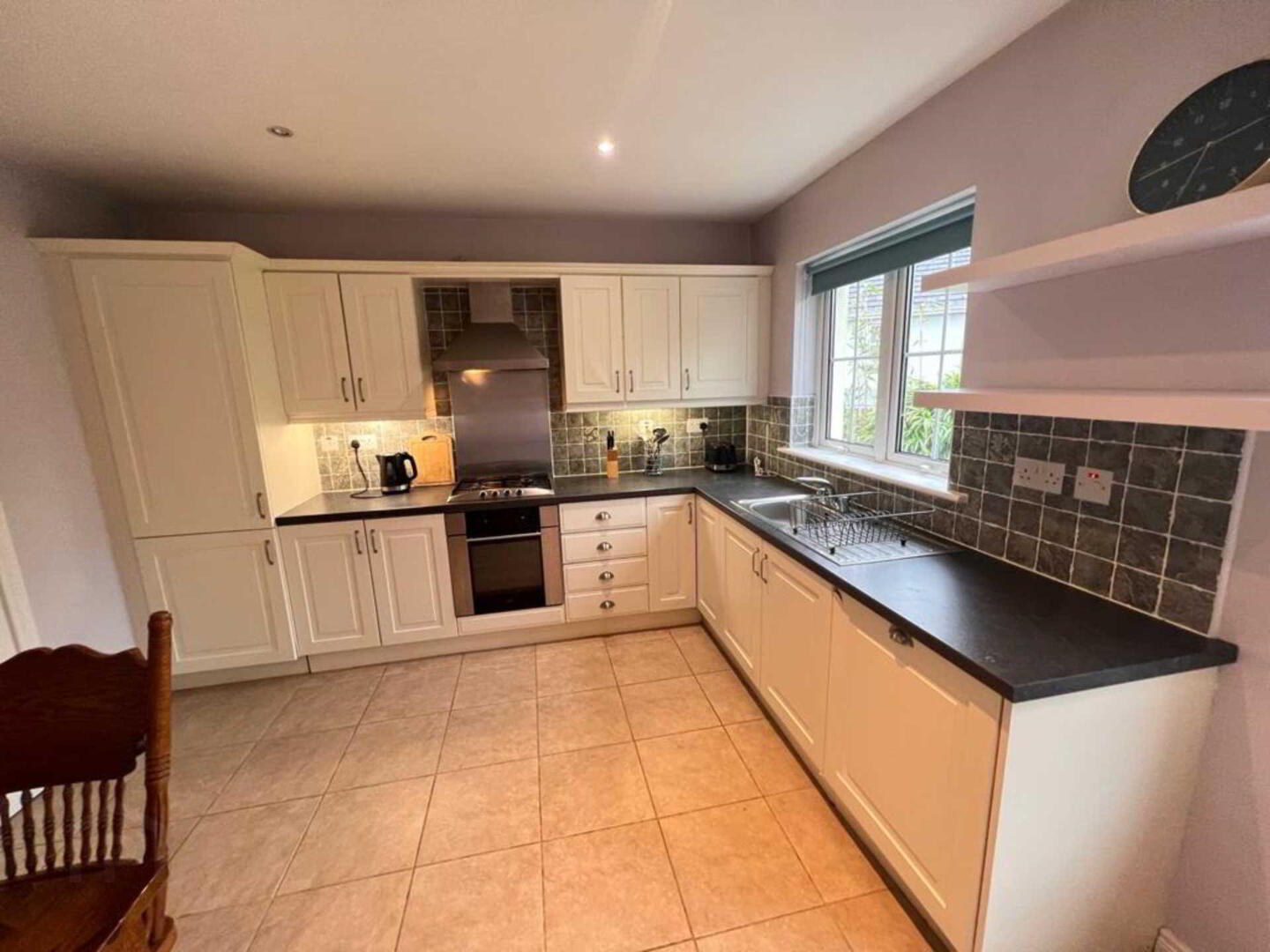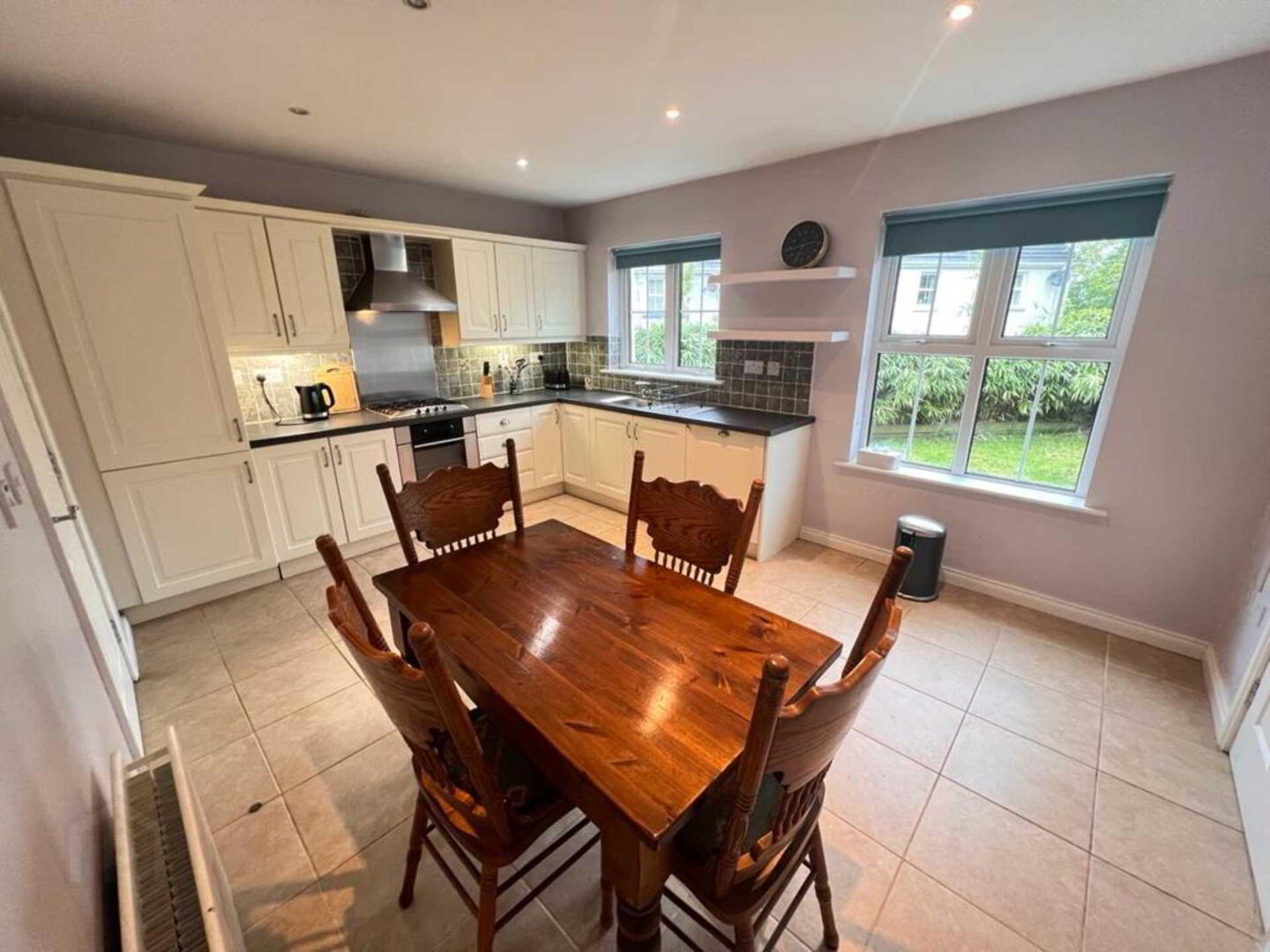 Tiled floor, walls painted, high/low level units tiled between, gas hob, stainless steel fanm 2 no. windows, 1 no. radiators