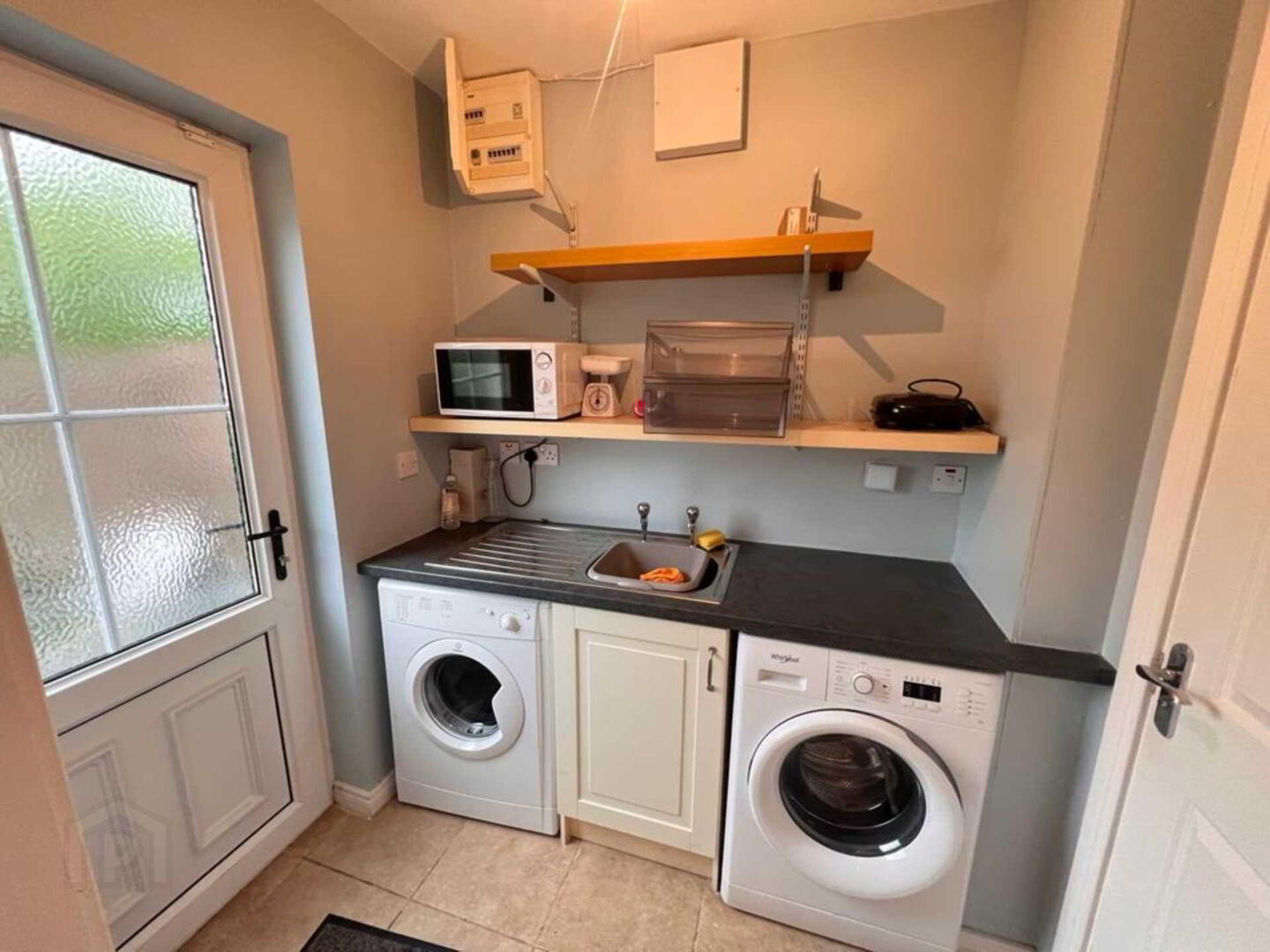 Tiled floor, walls painted, low level units, plumbed for washer, dryer and sink, shelved