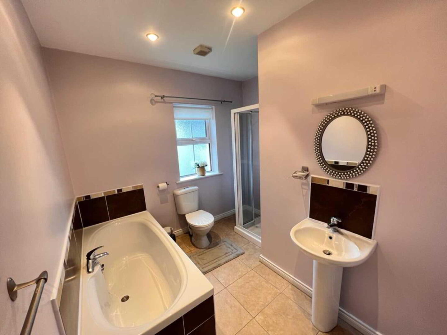 Tiled floor, bath, electric shower, wc, whb