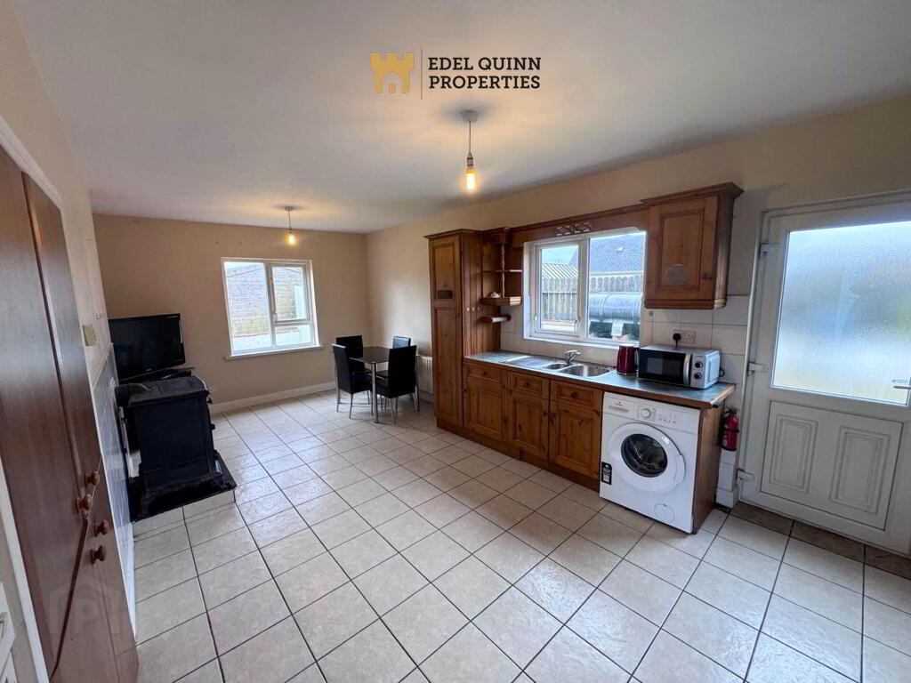 Walls painted, floors tiled, solid wood high and low level kitchen units, stand alone cooker and hob, 2 no windows, external door to rear, solid fuel stove with provisions for back bioler