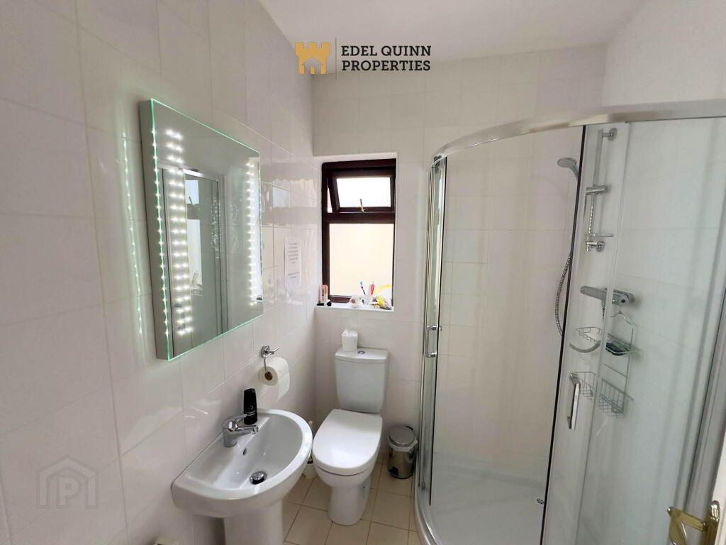 Walls tiled, floor tiled, wc., wash hand basin with Led mirror, stainless steel and glass corner shower enclosure with power shower, 1 window