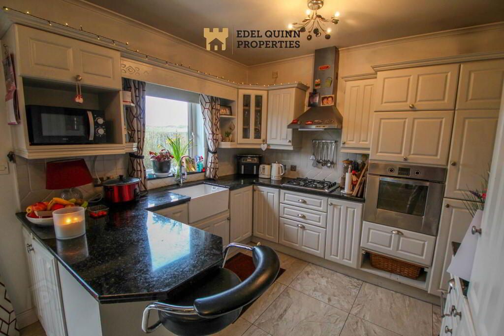 Floor tiling recently upgraded, painted high and low level units, Gas hob, French doors to rear, solid fuel stove in sitting area, decorative stone detail arch, 1 no window over sink, hidden utensil shelving