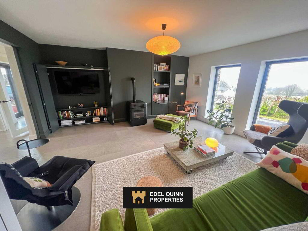 Upon entry you are greeted by a wonderfully bright entrance hall with donwlights, extra large velux and beautful white tones optimising the light in the space. Via double glass doors you enter the open plan kitchen/dining room which is finished to the highest of standards. The kitchen boasts a smeg cooker and quaker tap, as well as a very practical larder with ample storage space. The dining area is spacious with double doors to the rear and plenty of windows throughout. Pocket doors make way for the incredibly stylish living room which is home to the pellet stove, 2no. large windows and built in storage - with smart doors that hide the television should you wish.